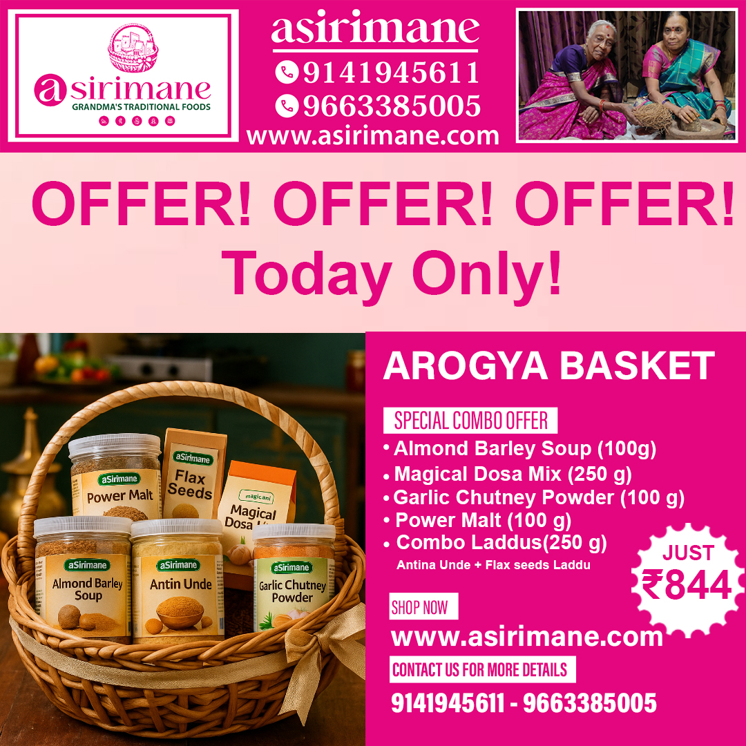 SPECIAL COMBO OFFER Almond Barley Soup (100g) Magical Dosa Mix (250 g) Garlic Chutney Powder (100 g) Power Malt (100 g) Combo Laddus(250 g) Antina Unde + Flax seeds Laddu
